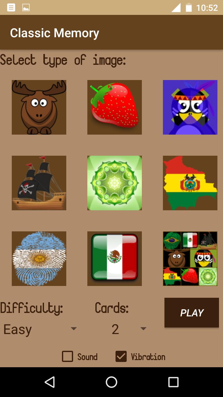 Classic Memory 게임, 턴당 2 ~ 3 개의 이미지를 기억하십시오.